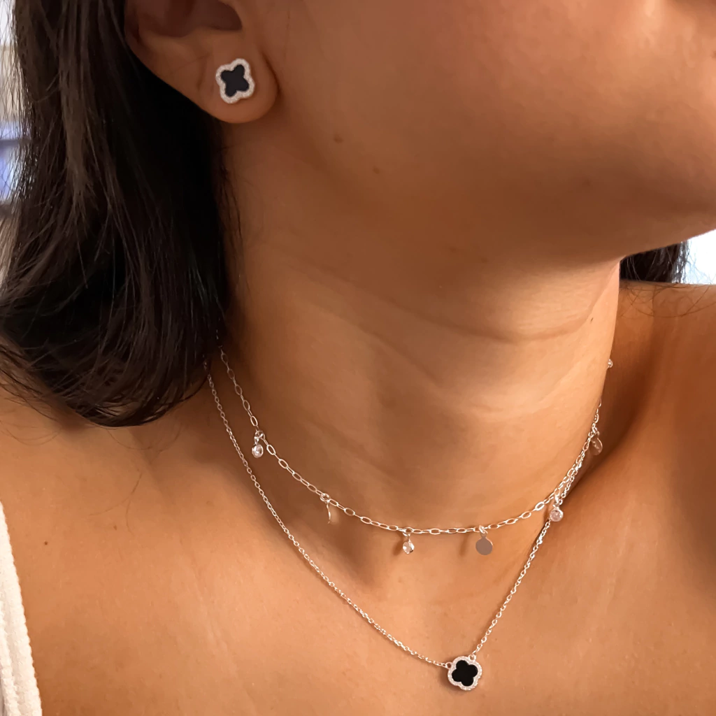 Material: Prata 925, garantindo durabilidade e um brilho excepcional. - Pedra Preta (ônix): Com bordas cravejadas de zircônia e acabamento refinado, o trevo traz um toque especial à sua joia.